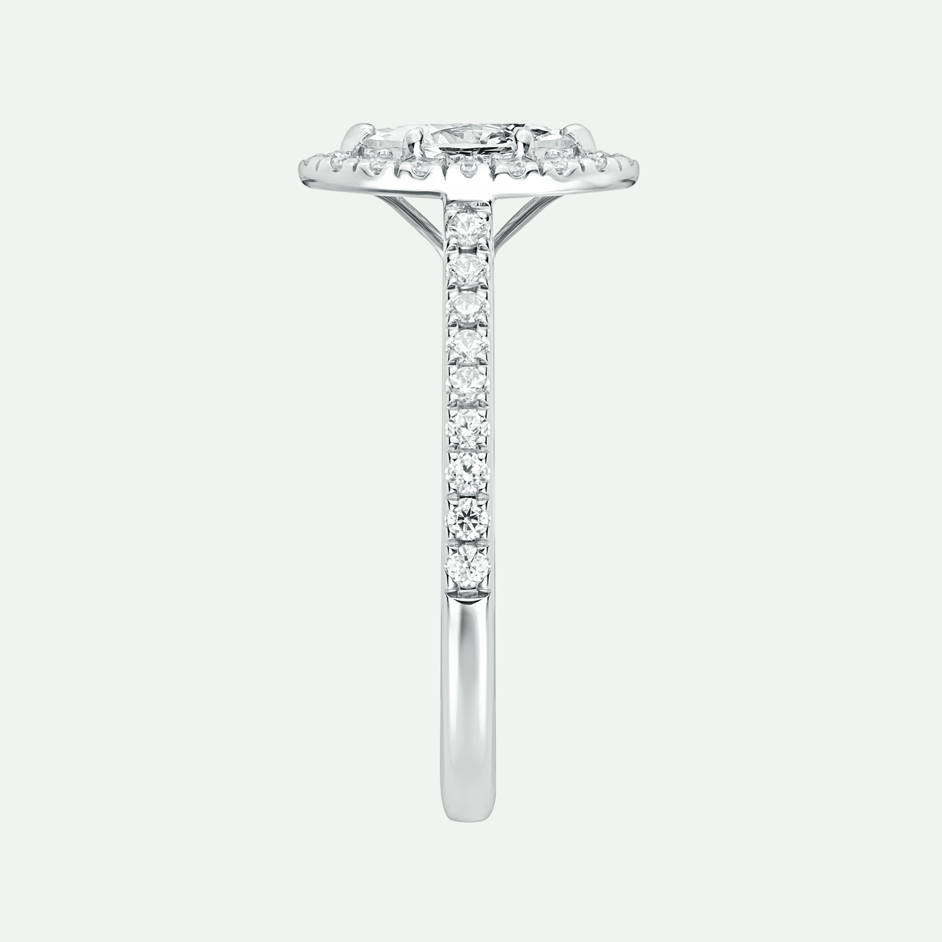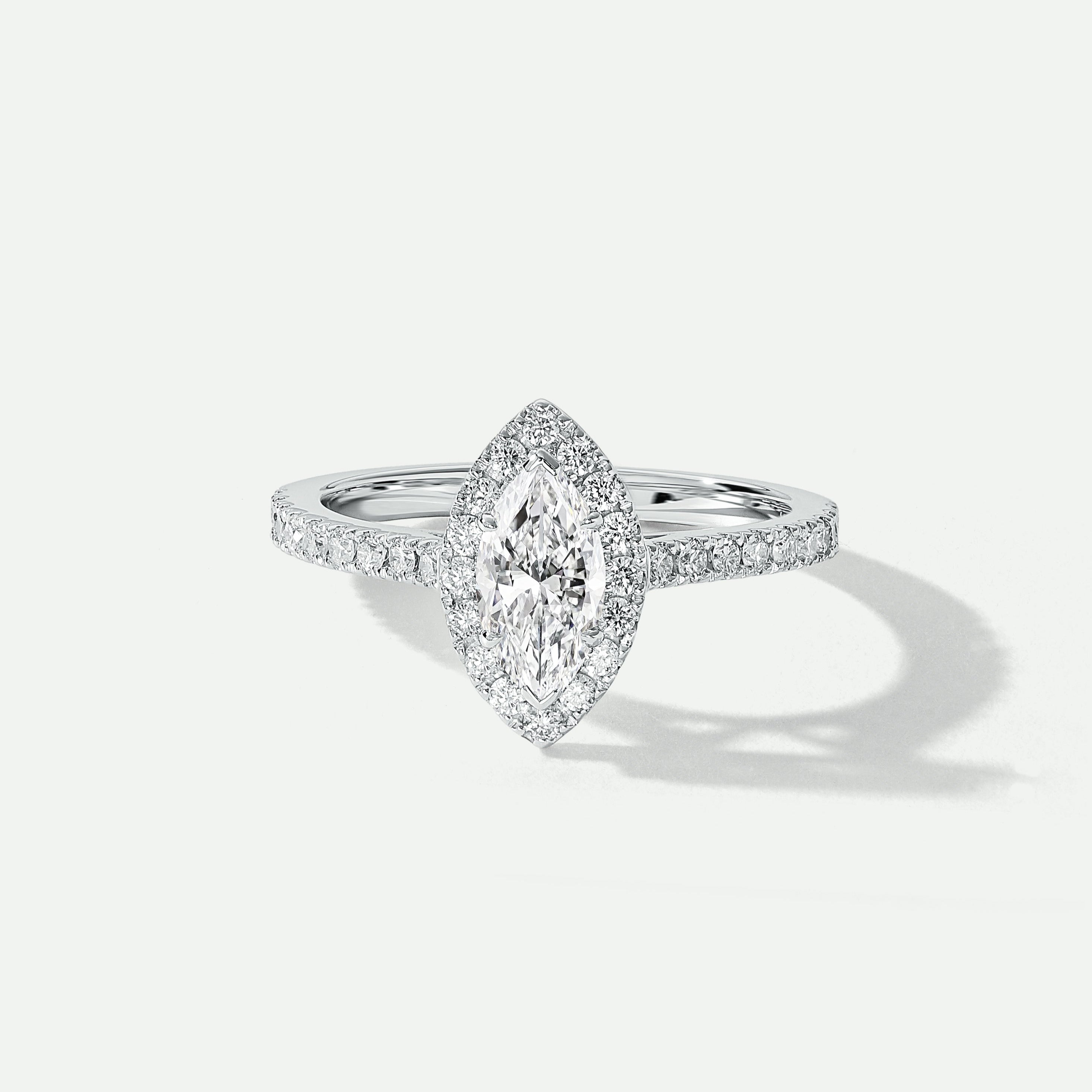 Our Astra lab grown diamond ring is set with a gorgeous marquise cut diamond centre stone, framed by a glittering halo and pavé set diamond shoulders. Beautifully crafted in 18 carat white gold, this gorgeous ring design is set with a total of 1ct of sparkling lab grown diamonds. The 0.65ct G VS2 marquise cut centre stone is IGI certificated and comes with a full diamond certificate.