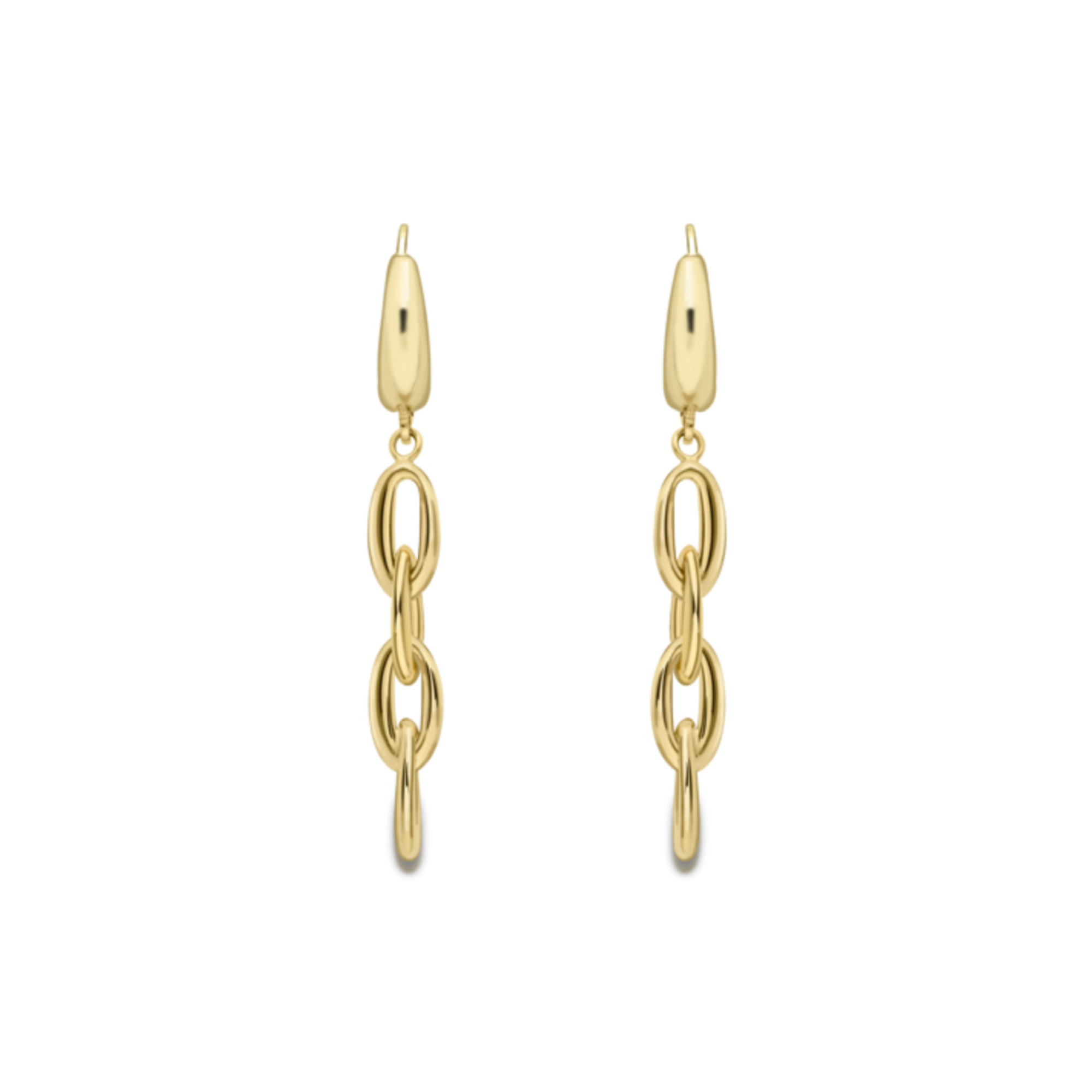 These 9ct yellow gold chain link drop earrings bring a modern, stylish touch to any outfit. The design features four polished oval links connected in a flowing drop, measuring around 45x5mm, giving them a noticeable yet wearable length. They hang comfortably from hook fittings, allowing natural movement that catches the light beautifully. Their simple, versatile design makes them perfect for everyday wear, while their polished finish and graceful lines ensure they can easily dress up an evening look or add a subtle statement to a more casual outfit.