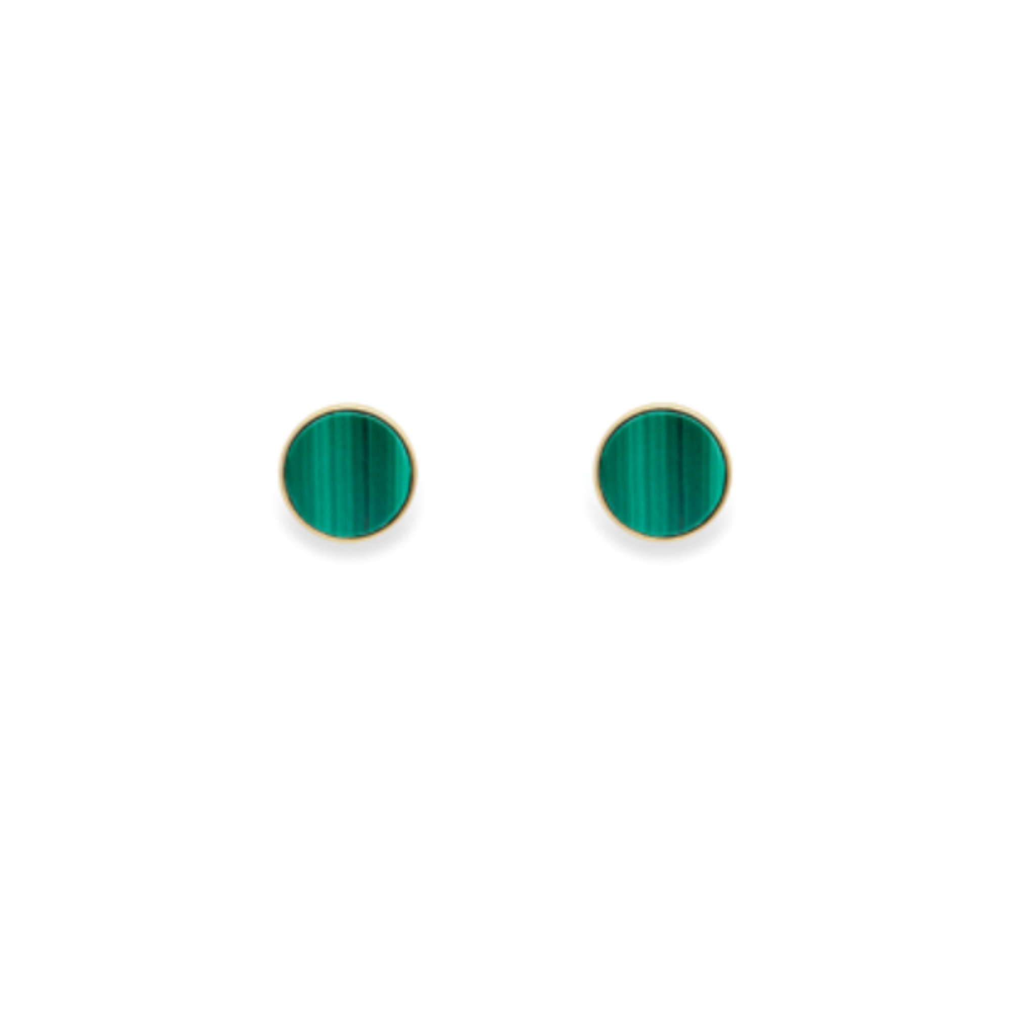 These 9ct yellow gold stud earrings feature vibrant round malachite stones, renowned for their rich green hues and distinctive natural banding that gives each stone a unique character. Set in polished yellow gold, the 6x6mm earrings catch the eye with their bold colour and organic patterns. Secured with post and butterfly fittings, they’re ideal for everyday wear or for adding a striking touch of colour to any outfit.