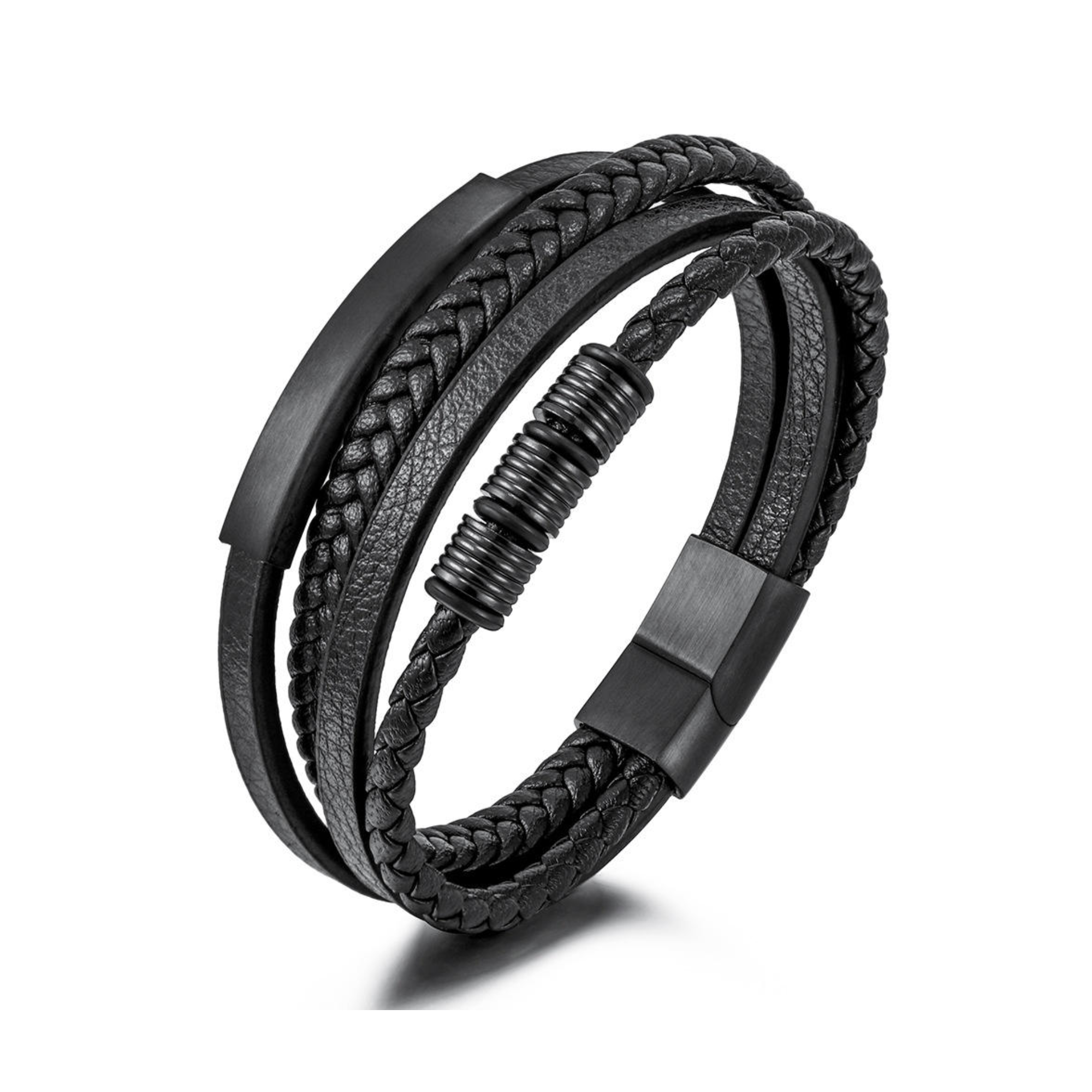 Make a bold statement with this all-black men’s multi-layer leather bracelet, designed with a rugged mix of braided and smooth leather straps for a strong stacked look in one piece. The centre Black Coil Bead Detail adds a clean industrial edge with ribbed matte-black metal accents, while the matching matte-black clasp keeps it secure, comfortable, and easy to wear.