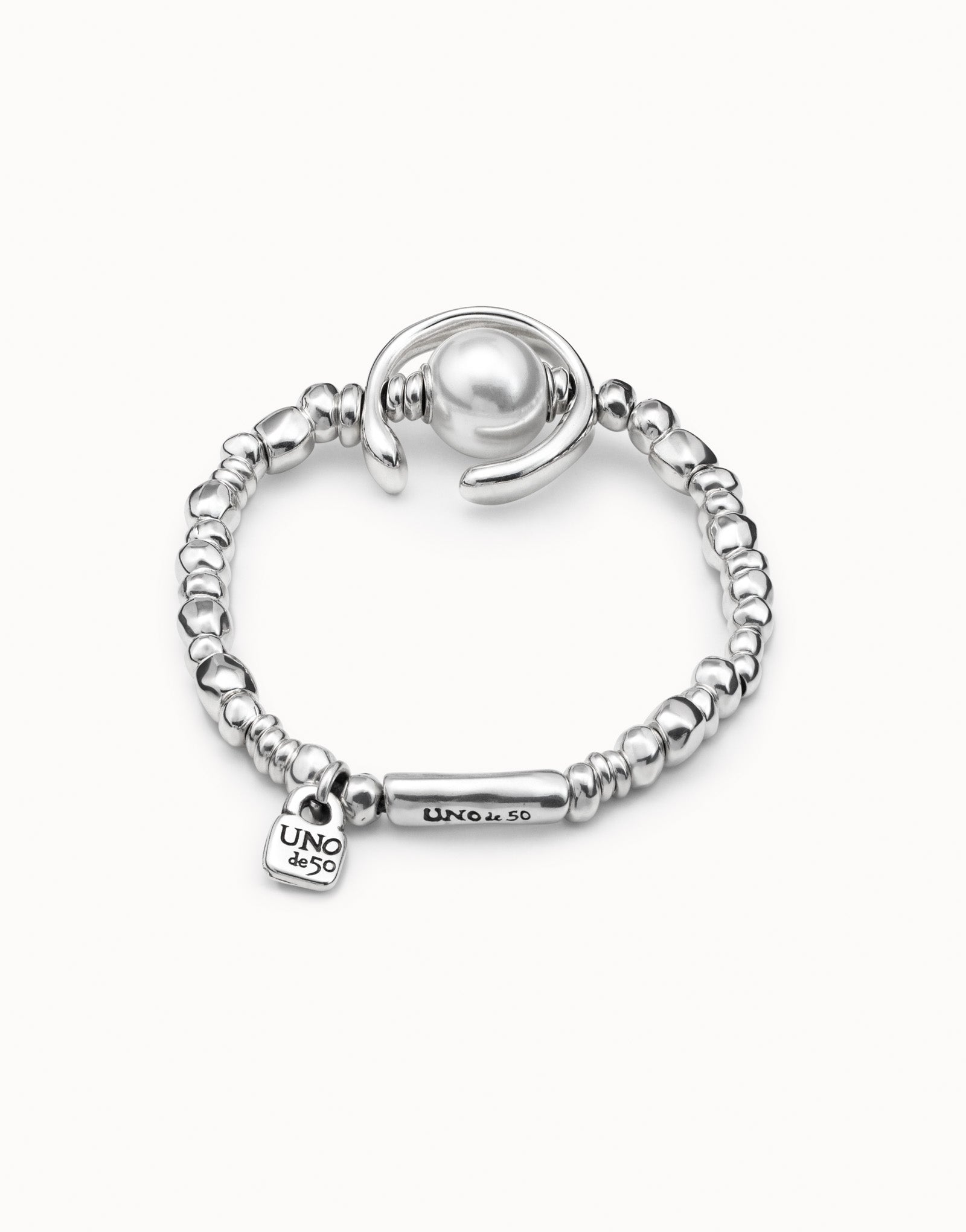 Unique design elastic bracelet made with round beads that combines a silver-plated hoop and a white pearl. Handmade in Spain.