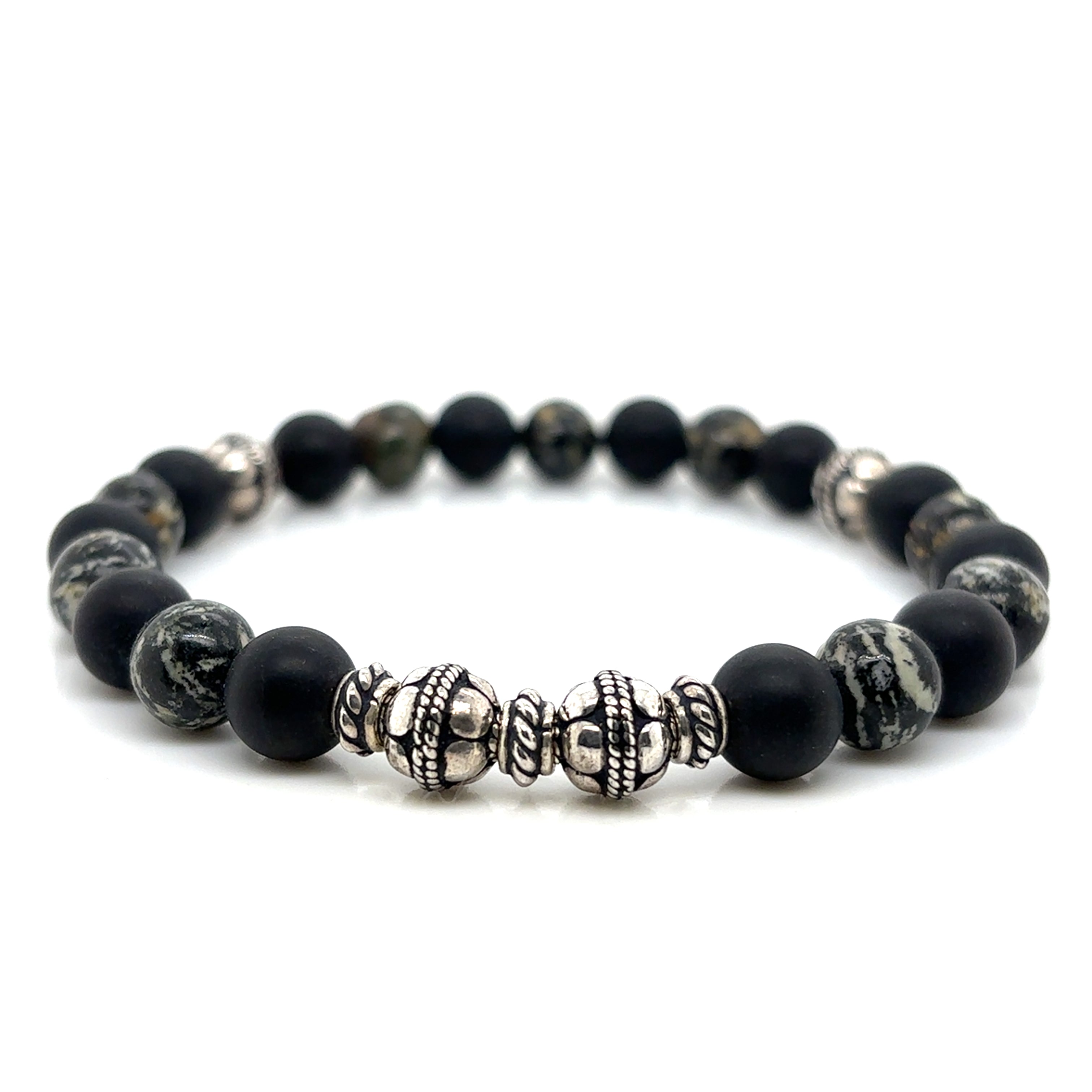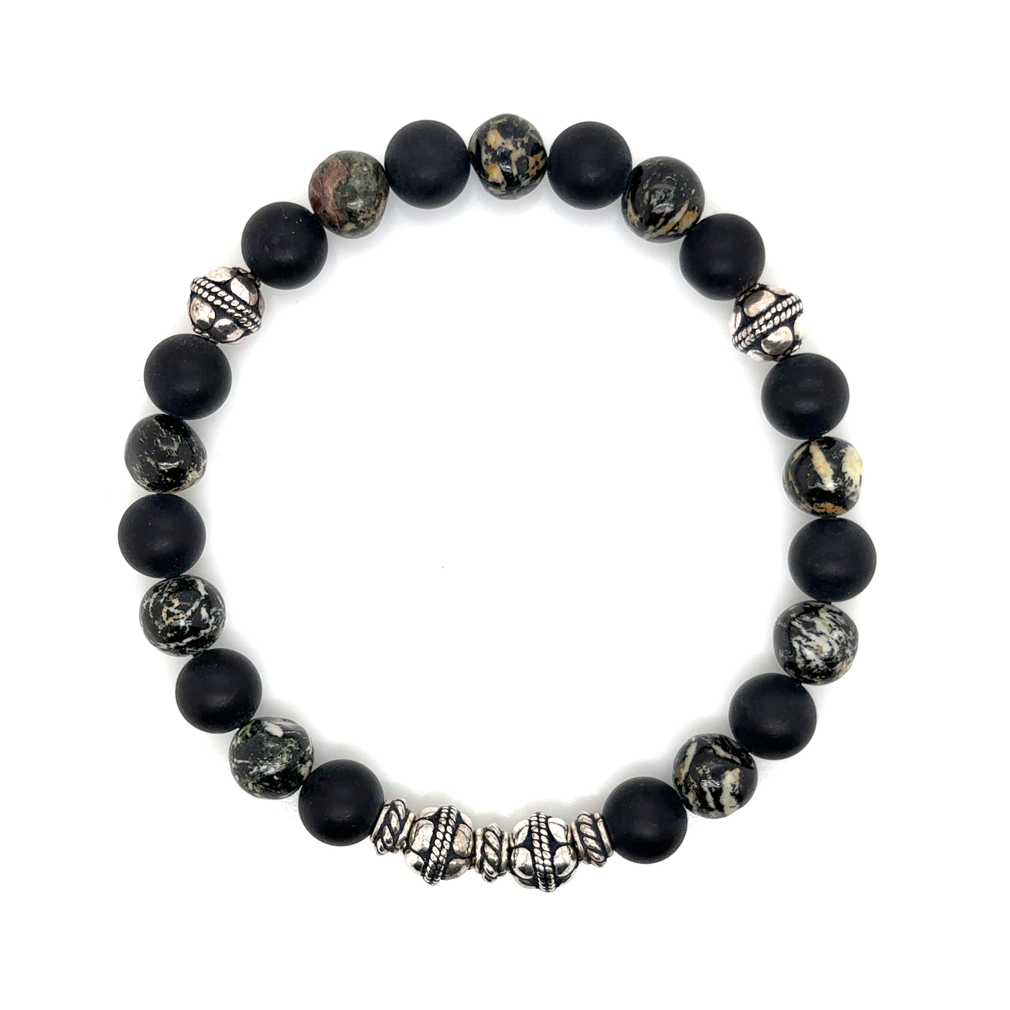 The Wildwood Dandrite Agate & Onyx Bracelet pairs the soft matte finish of black onyx with the natural, earthy patterning of dendrite agate. Each agate bead features unique moss-like markings and warm tones, creating a look that feels organic and full of character. Finished with detailed silver feature beads for added texture and a subtle statement. Strung on a durable stretch cord for a comfortable fit, this bracelet is perfect for everyday wear and ideal for stacking.