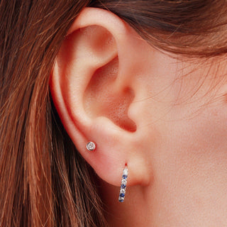 Close-up of an ear wearing a diamond stud earring with blonde hair.