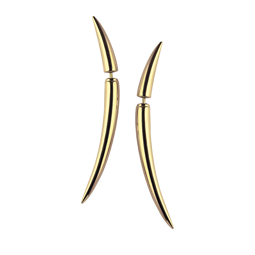 Quill Earrings are handcrafted from yellow gold vermeil. The double-edged Quill is an elegant yet dangerous curve. Created for the Alexander McQueen SS03 show, Irene, it was an expansion of the pointed aesthetic Leane curated in the 90s. The porcupine-inspired shape is reverent to our House code: Line, dramatic spikes, androgynous cuts with a modern sensibility. Distilled, here, into powerful yellow gold earrings, Quill's curvilinear lines are softened, with symmetrical framing of the face and an elongated neck, creating drama and dynamism. Designed as a two-piece construction, with a left and a right side and an elegant drop of 36mm - a compact, subtle length. Available as singles, in standard or large sizes.