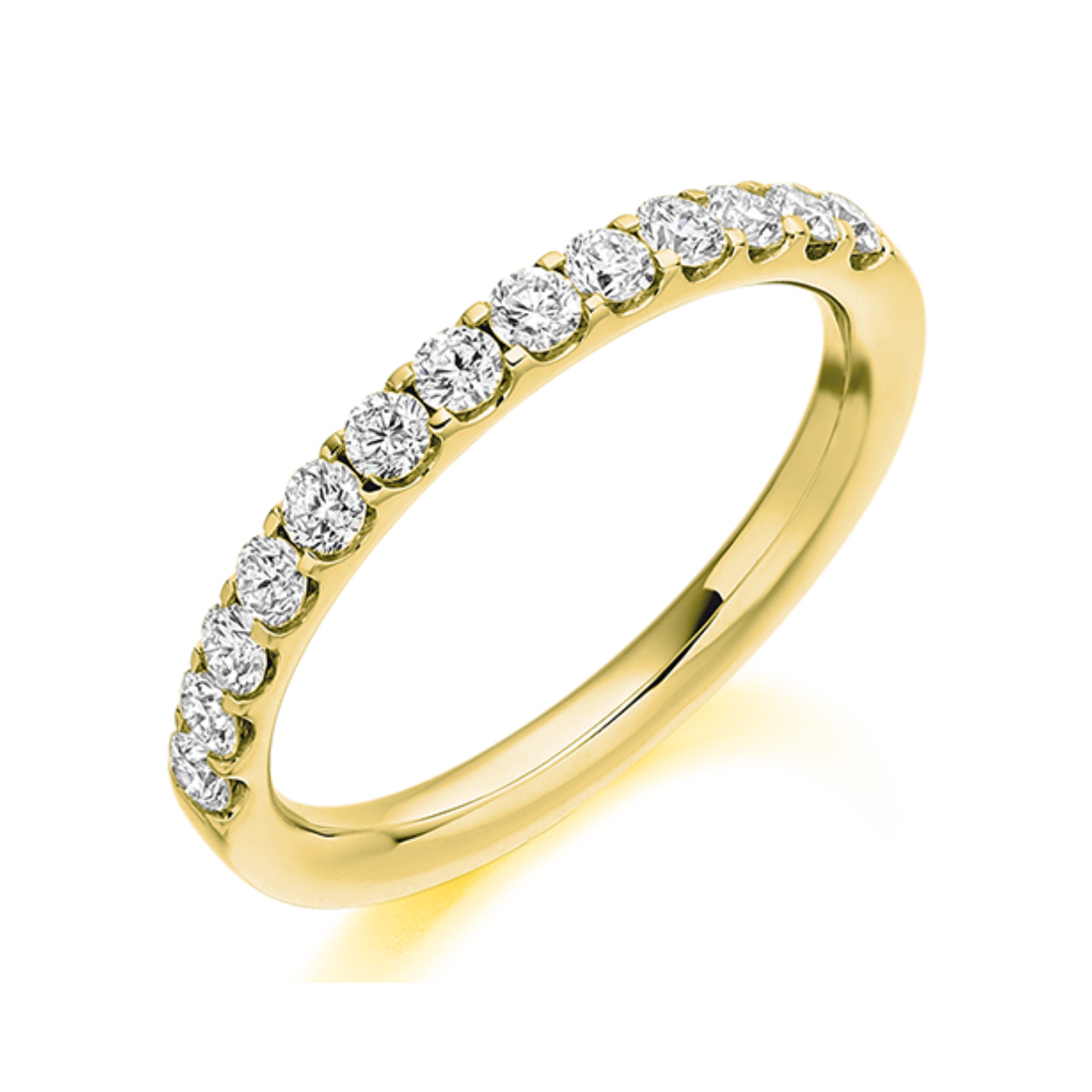 This 18ct yellow gold 0.50ct diamond half eternity ring is chosen for moments when love feels certain and worth celebrating. A continuous row of round brilliant cut diamonds is micro-claw set along the band, allowing each stone to catch the light while sitting comfortably against the finger. Warm, radiant, and full of meaning, it’s a piece designed to be worn every day as a reminder of the connection it represents.