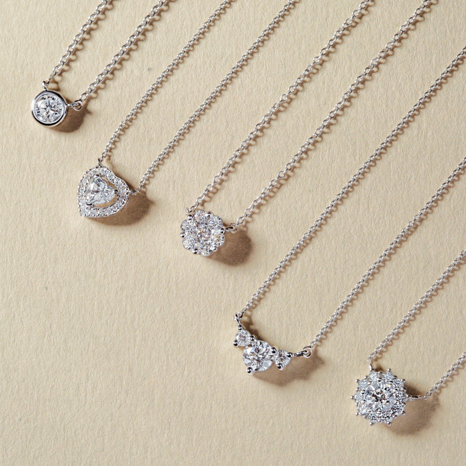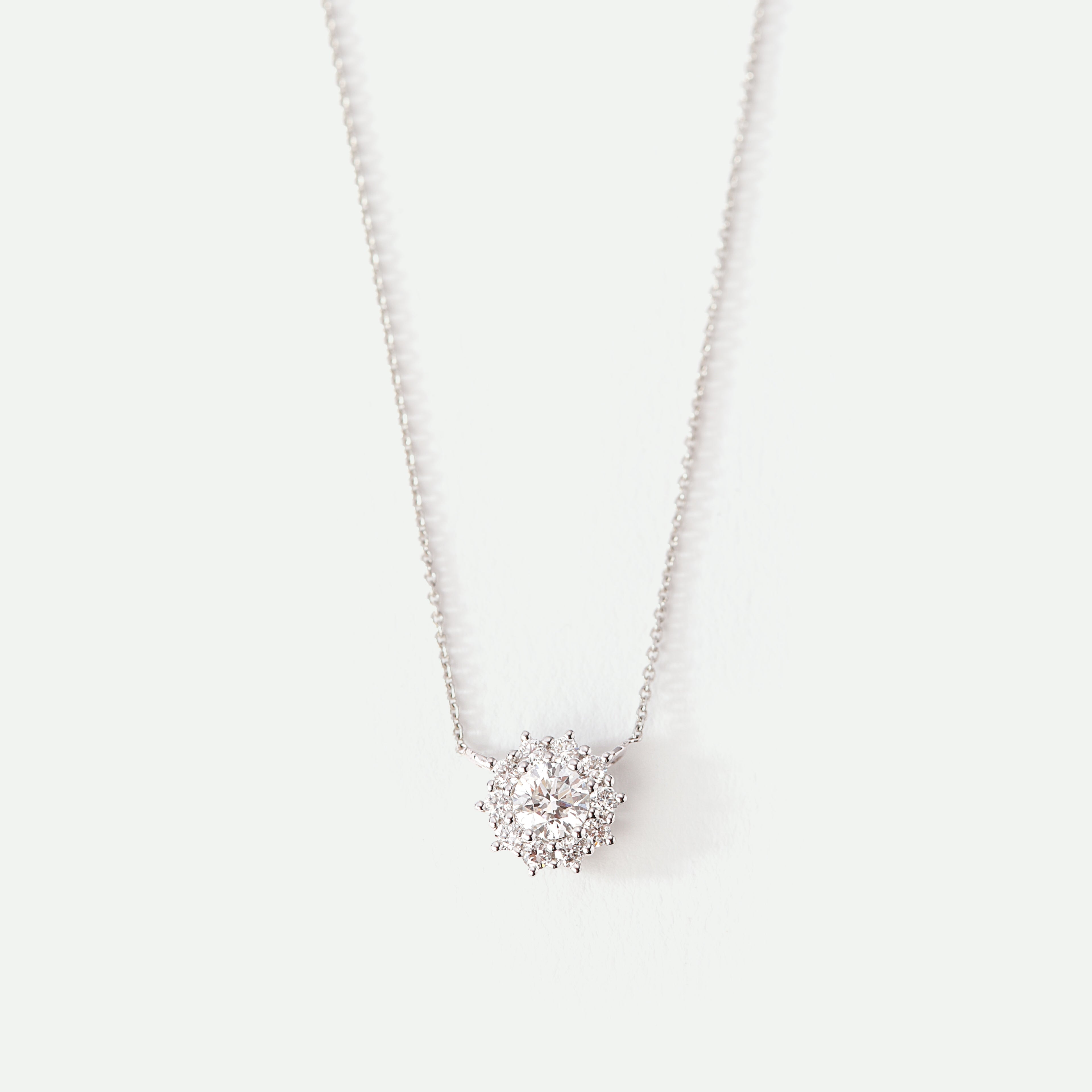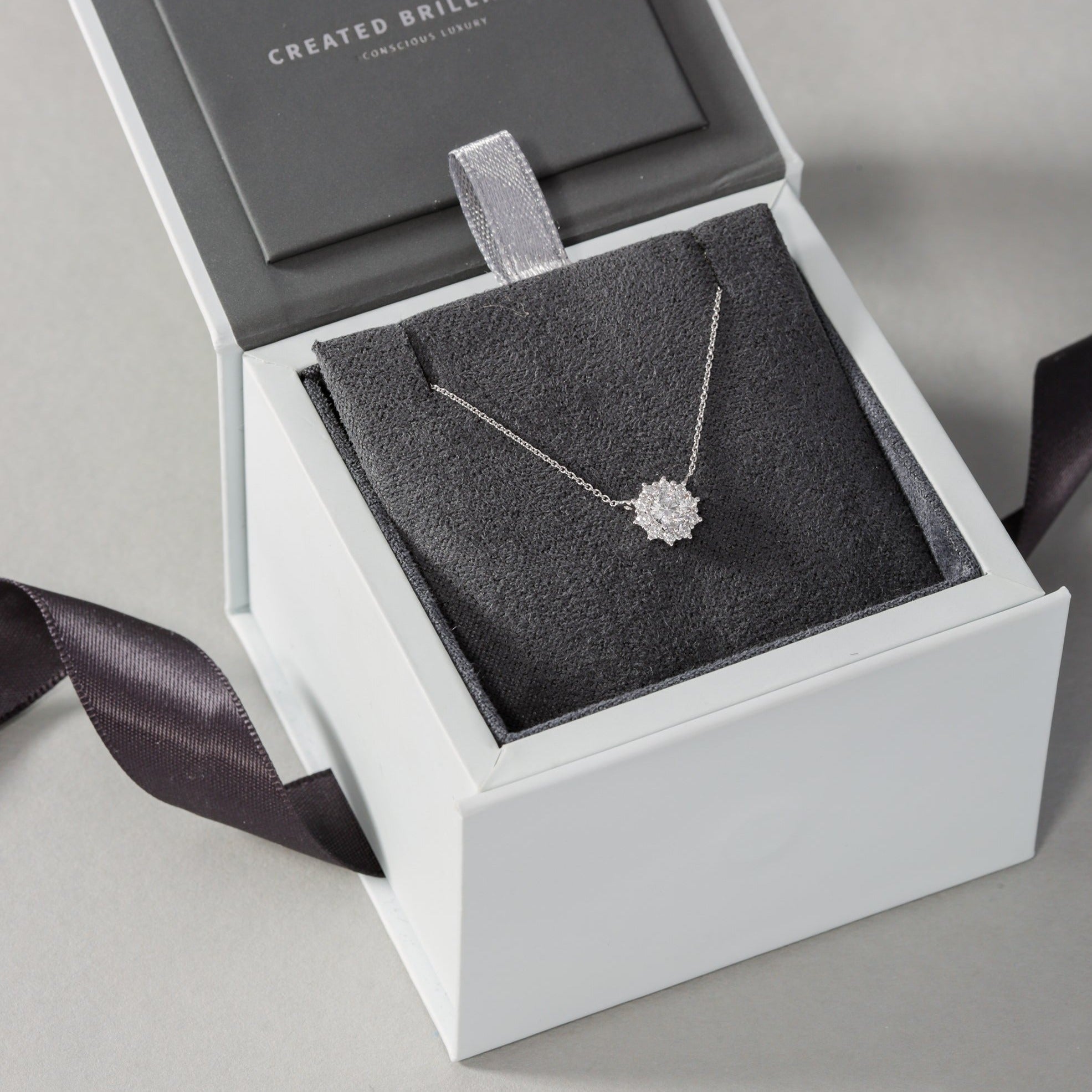 Our Anya necklace is beautifully crafted in 9 white carat gold and set with 0.36ct of brilliant lab grown diamonds in a charming cluster design. The 9 carat gold chain measures 18 inches in length.