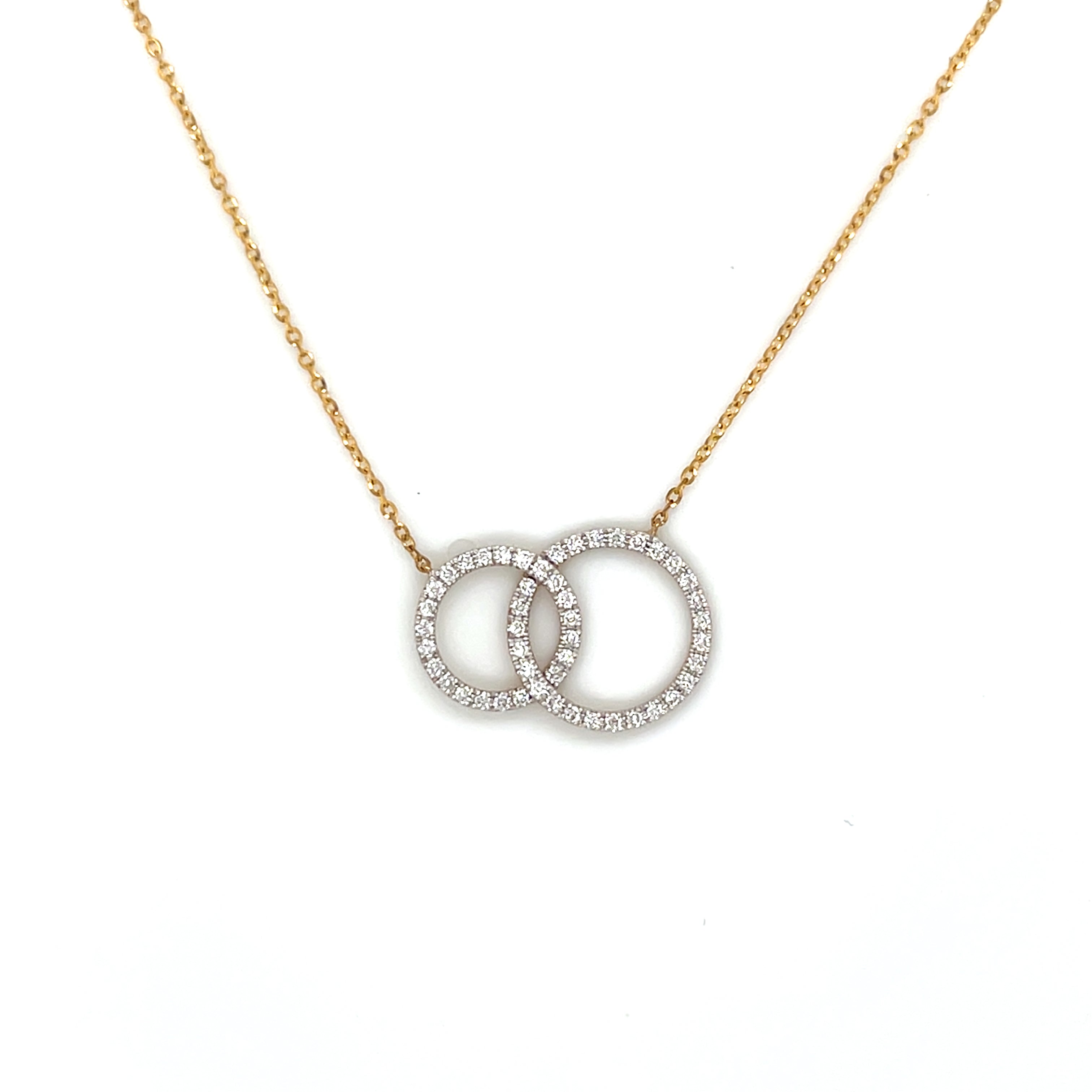 This 9ct gold necklace features two seamless, interlocking circles, each brilliantly illuminated by 48 brilliant-cut diamonds. Set in contrasting white metal to enhance the sparkle of every stone, the pendant is beautifully paired with a delicate yellow gold chain. It's a striking two-tone diamond necklace that serves as a sophisticated statement piece, perfect for gifting or instantly upgrading your everyday style.