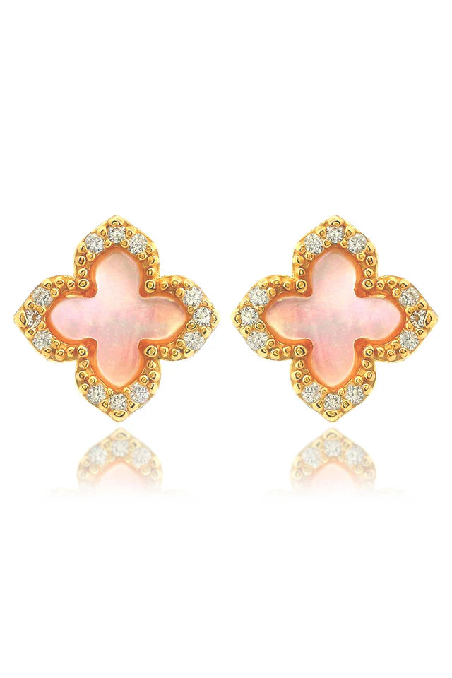 ntroducing the Sydney Soirée Fairwater Mother of Pearl Stud Earrings, a symbol of elegance and refinement. Crafted from luxurious 18k gold e-coated 925 sterling silver, these earrings are designed to complement the pieces in the Fairwater collection seamlessly. At the heart of each stud earring lies a delicate mother-of-pearl pointed four-leaf clover, exquisitely accented with a shimmering stone-set edging. The intricate design reflects timeless beauty and sophistication, perfect for both formal occasions and everyday wear. Measuring approximately 9.1mm wide, these earrings boast a size that is both understated and eye-catching, making them versatile additions to any jewellery collection. The rhodium-plated finish enhances durability and adds a lustrous sheen that complements the natural iridescence of the mother-of-pearl. Embrace luxury and elegance with the Sydney Soirée Fairwater Mother of Pearl Stud Earrings, where craftsmanship meets sophistication in every detail. Whether worn alone or paired with other pieces from the Fairwater collection, these earrings elevate your style with their timeless appeal and impeccable design.