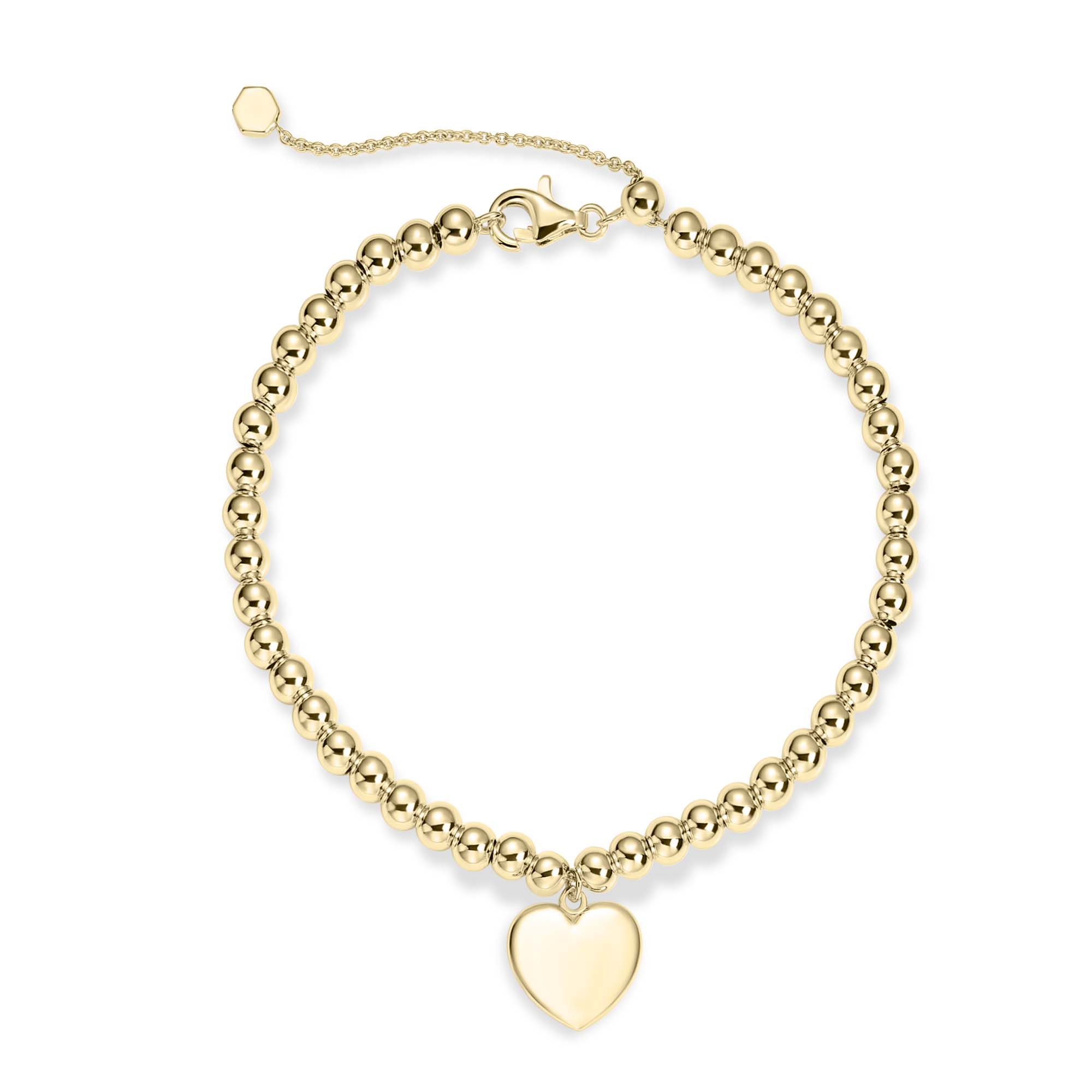 Add a personal touch to your jewelry collection with this gold plated silver beaded bracelet, featuring a charming heart-shaped pendant that can be engraved with a name, initials, or a special message. Crafted from high-quality sterling silver and finished with a gold plating, this bracelet showcases polished silver beads that create a timeless and elegant look.