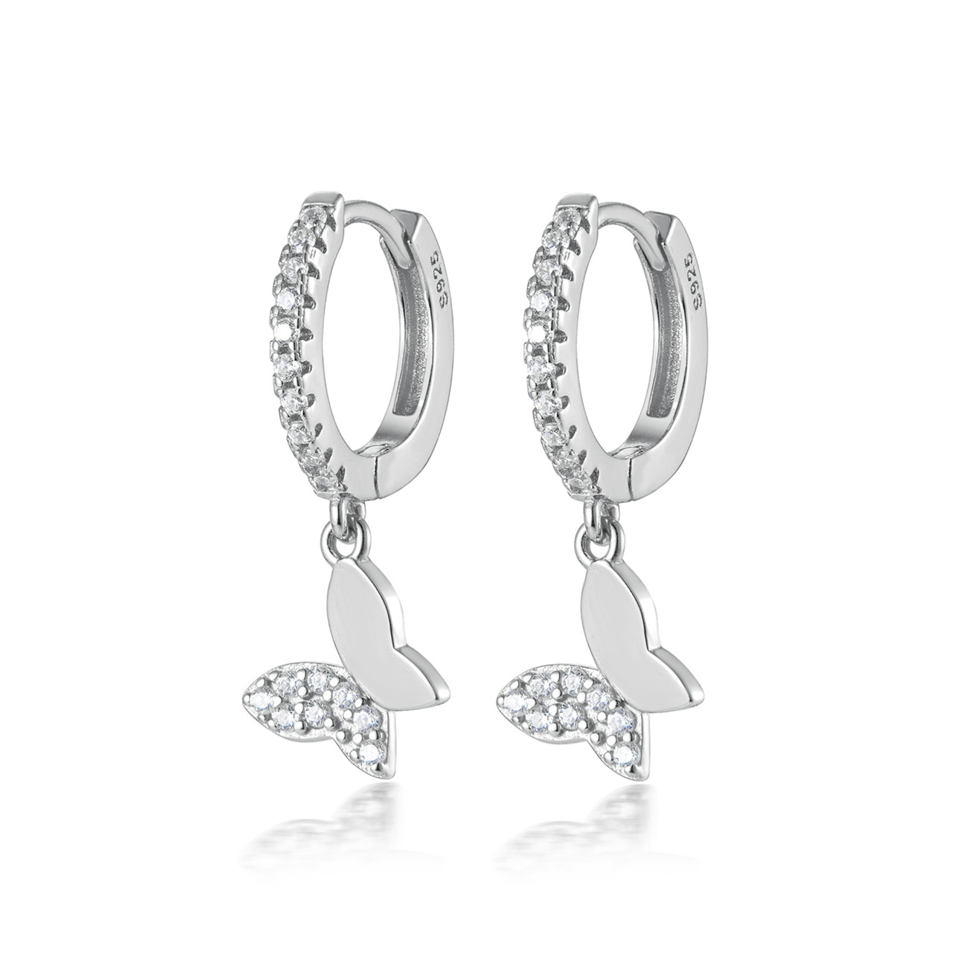 These sterling silver huggie hoops feature a delicate butterfly charm with a unique half-and-half design with one wing set with sparkling cubic zirconia stones, the other in smooth polished silver. The contrast between shimmer and shine gives these earrings a stylish, modern look. Designed for comfort, the small hoop hugs the ear closely and fastens securely with a hinged clasp, making them perfect for both everyday wear and special occasions.