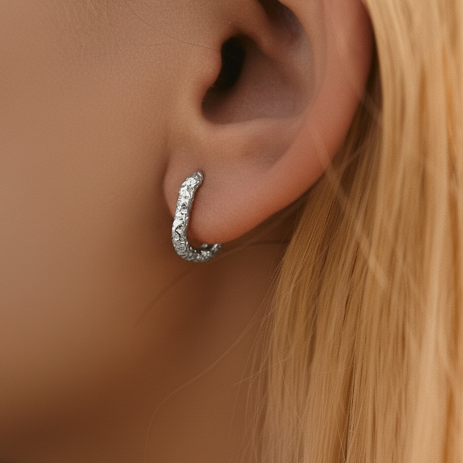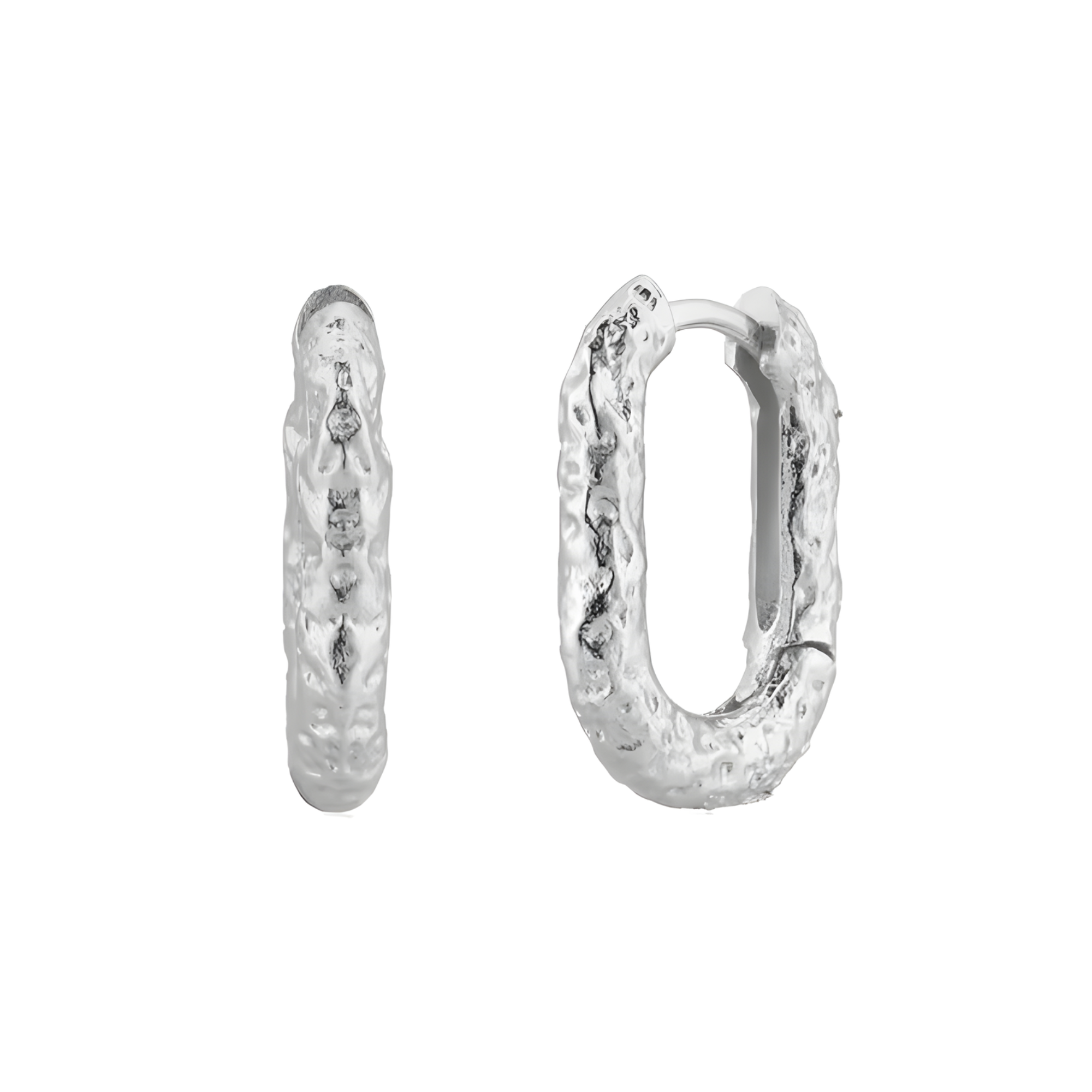 These rectangular hoop earrings offer a contemporary twist on a classic design. Crafted with a molten, textured finish, each piece catches the light with subtle movement, creating a striking, artisanal effect. The angular silhouette adds a modern edge, making them versatile enough for both everyday wear and special occasions.