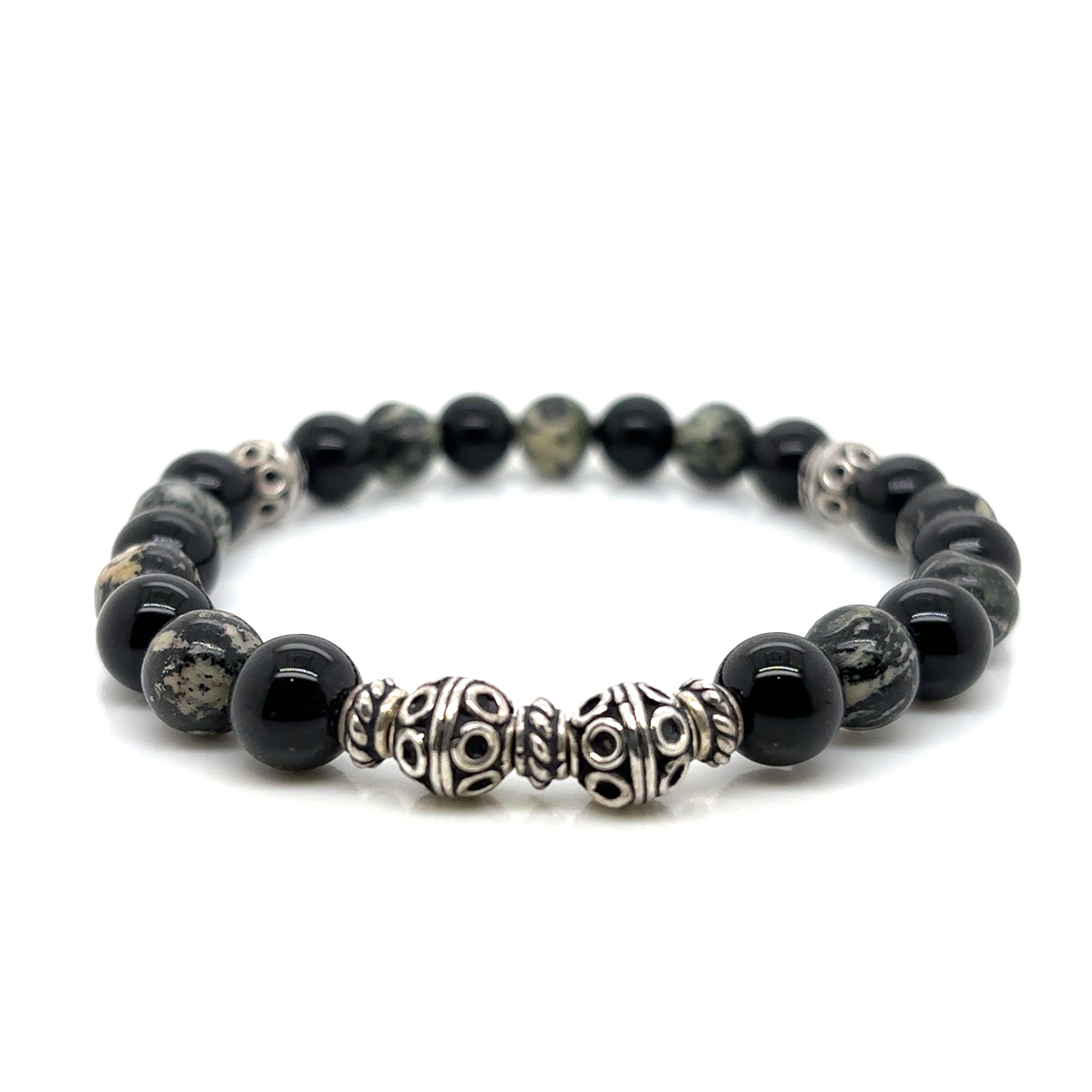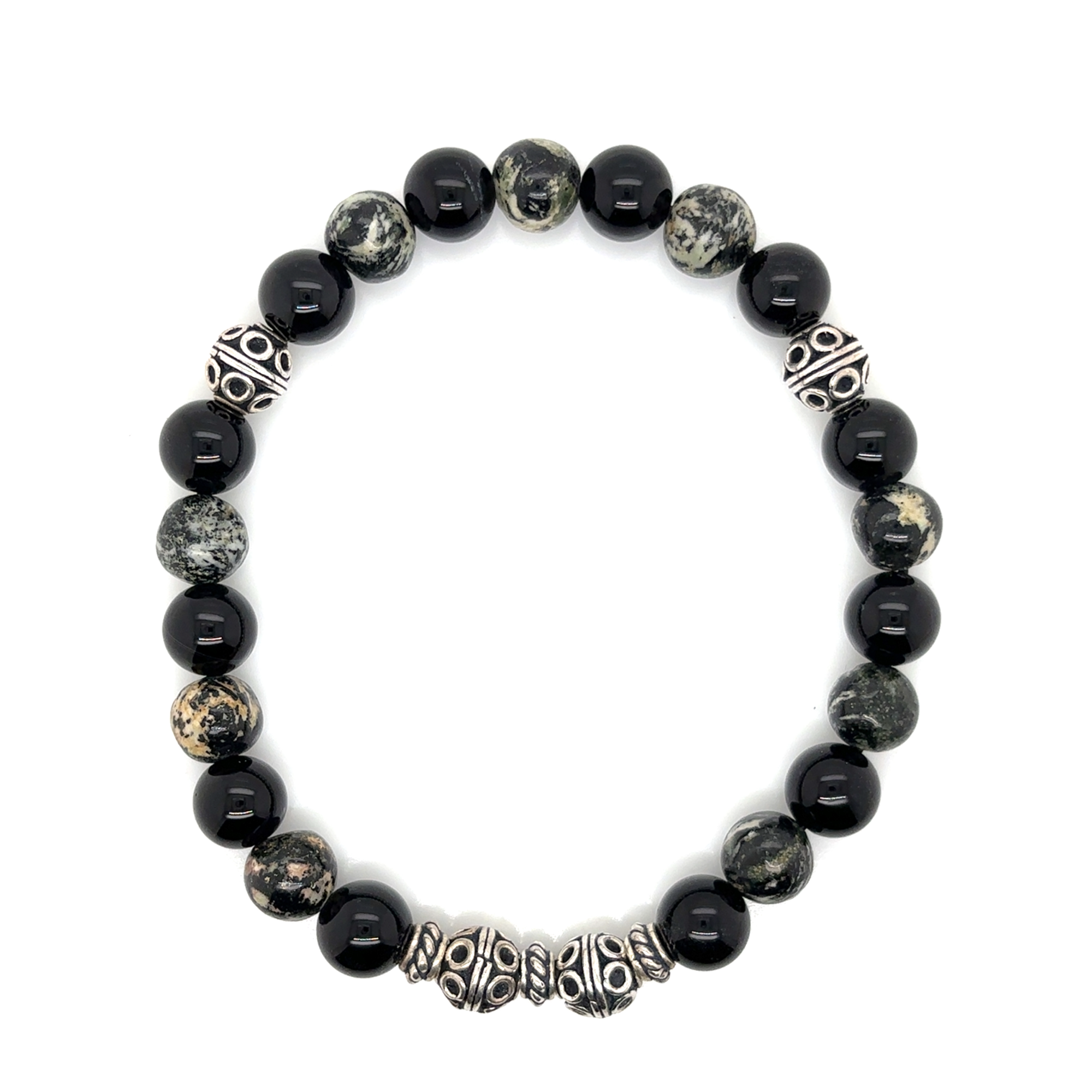 The Forest Ember Dandrite Agate & Onyx Bracelet blends the deep shine of black onyx with the natural, moss-like patterning of dendrite agate for a bold, earthy contrast. Detailed silver-tone feature beads add texture and definition, creating a statement look that still feels clean and wearable. Strung on a durable stretch cord for a comfortable fit, this bracelet is perfect for everyday wear and looks great worn alone or stacked.