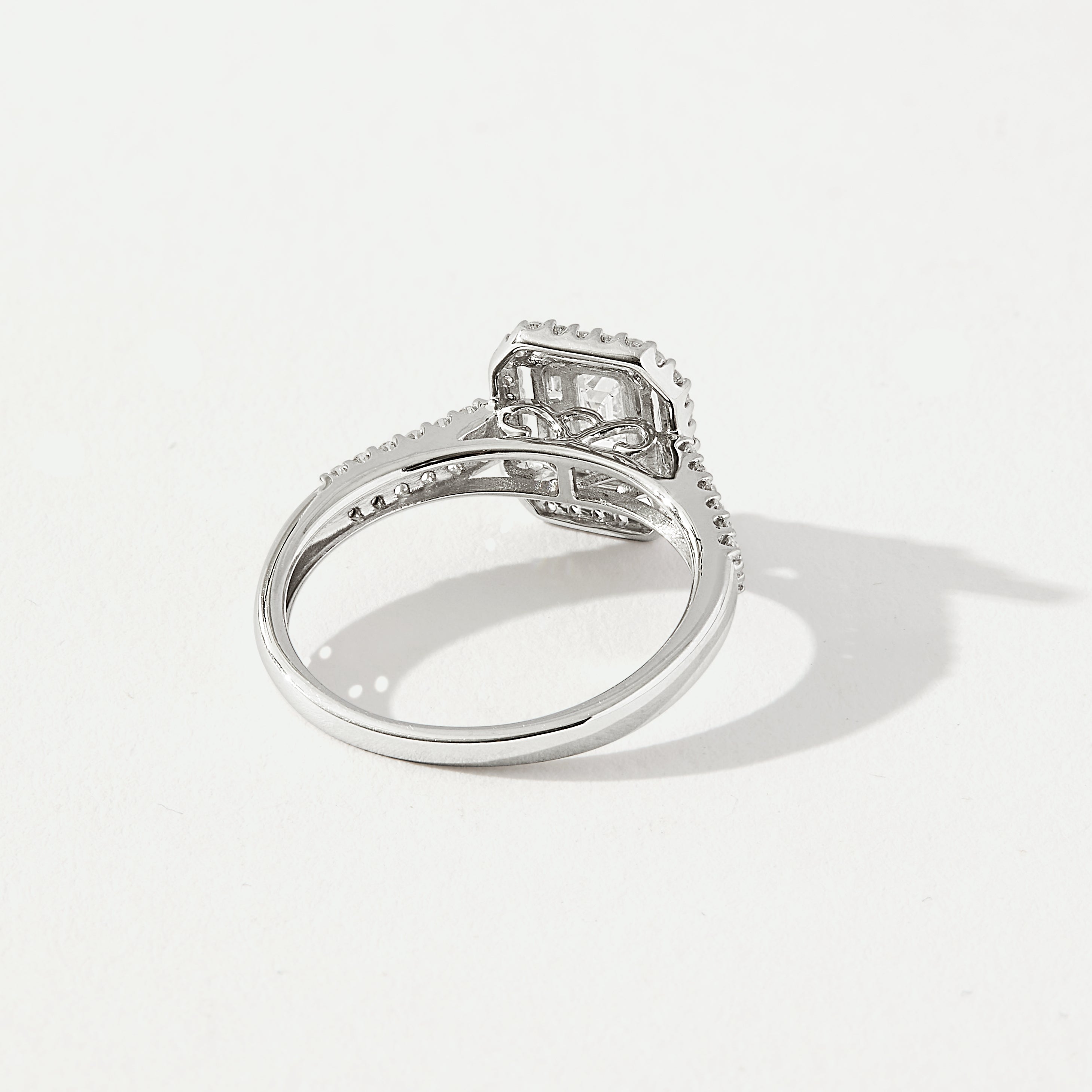Our Gwen ring is crafted in 9ct white gold and features a dazzling array of mixed-cut lab-grown diamonds with a total carat weight of 0.66ct. At its heart lies a radiant 0.25ct emerald-cut diamond, framed by a geometric arrangement of baguette and round brilliant diamonds creating an Art Deco elegance. Extra sparkle is added by two rows of diamonds on the shoulders.