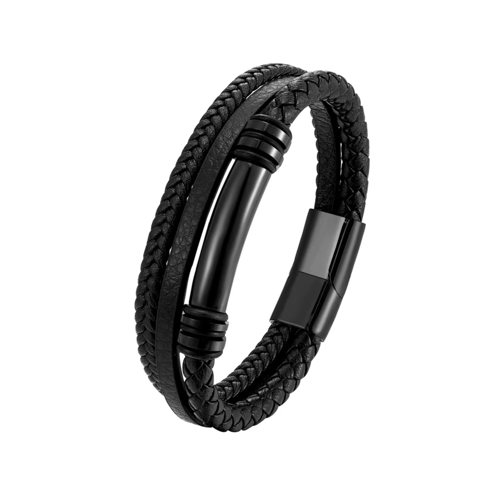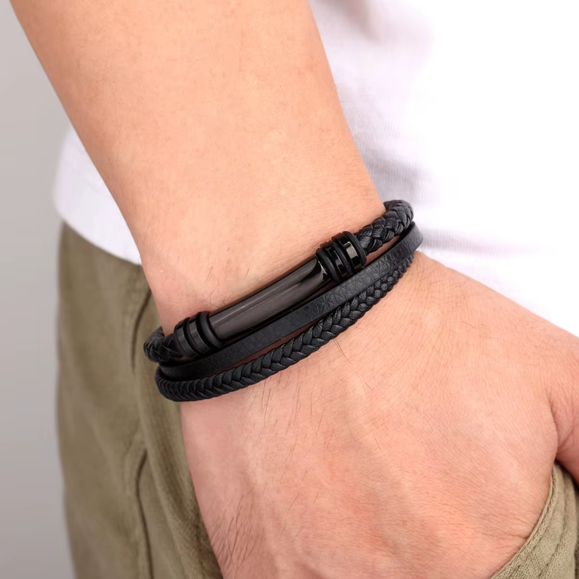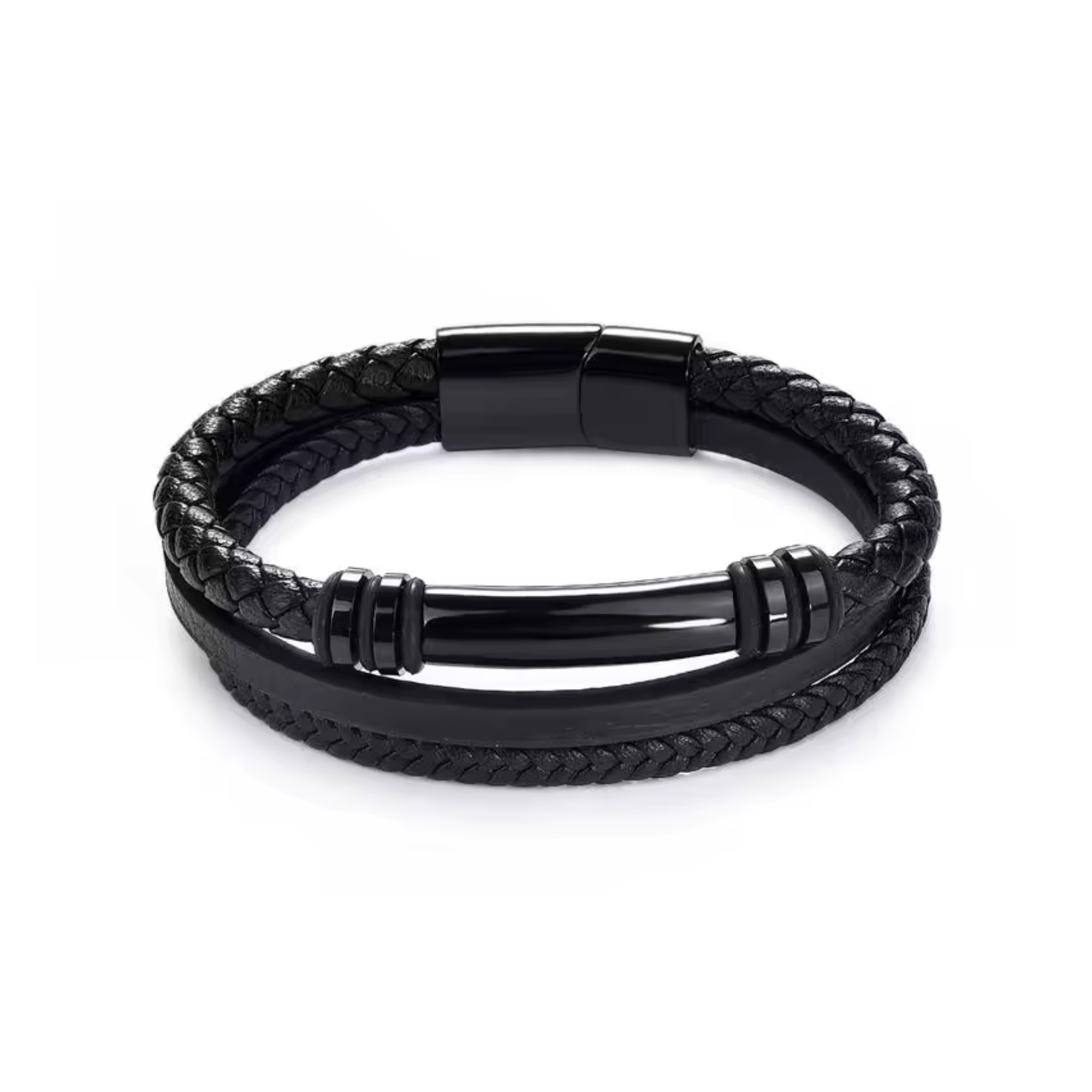 The Black Polished Bar Detail 3-in-1 Leather Bracelet delivers a sharp, modern look with layered texture and subtle detail. One row features a woven black leather band finished with a polished, rounded bar for a clean focal point, while a second row of plain black leather keeps the design grounded and minimal. The third row, crafted from plaited leather, adds depth and contrast, completing the piece with a strong, masculine finish.