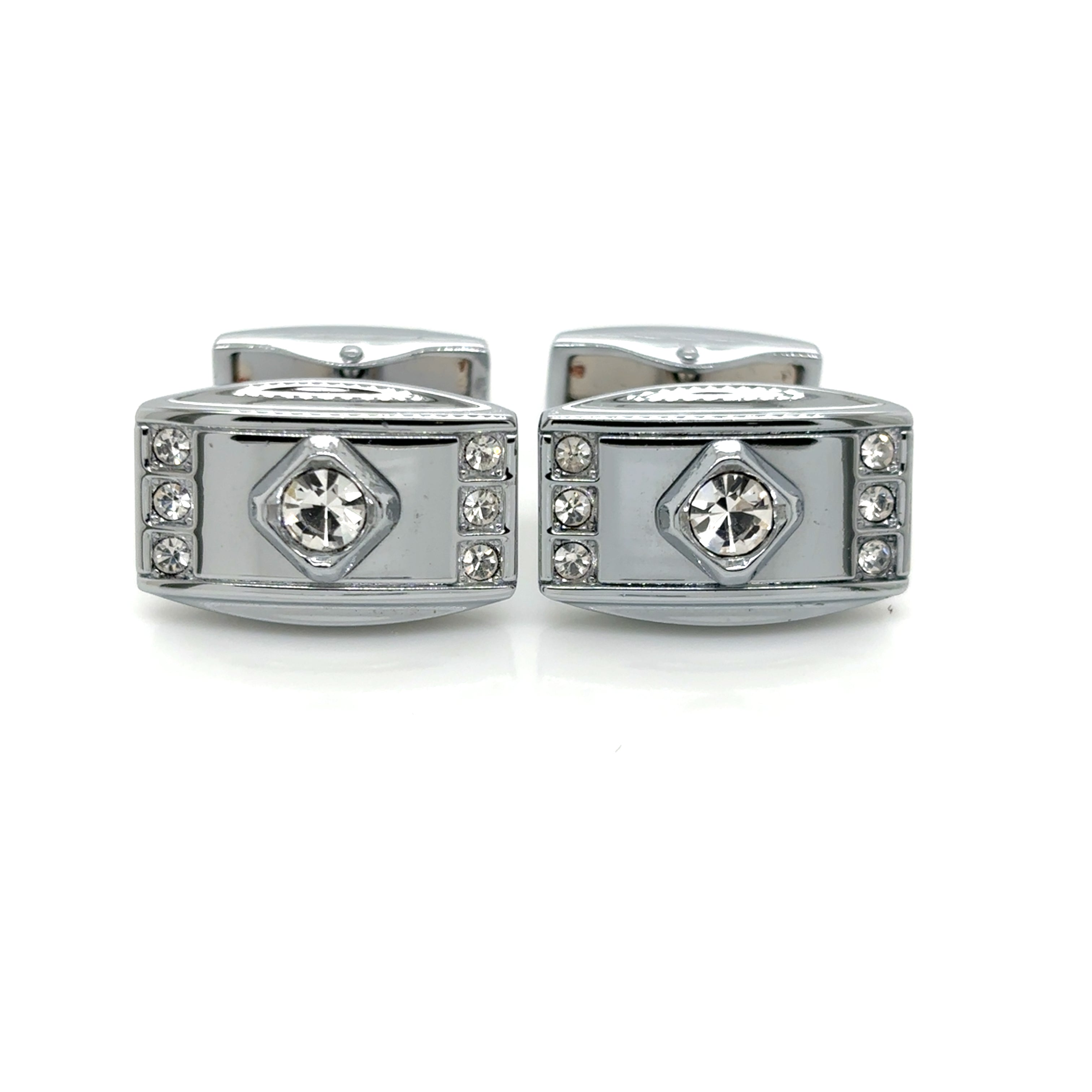 Add standout sparkle to your formal look with these stainless steel cufflinks, designed in a bold rectangular shape with a polished silver-tone finish. Featuring a clear crystal center framed by matching crystal accents along each side, they deliver a sharp, modern style with just the right amount of shine. Finished with a secure swivel-back closure for easy fastening and a comfortable fit, these cufflinks are perfect for weddings, black-tie events, and formal business wear.