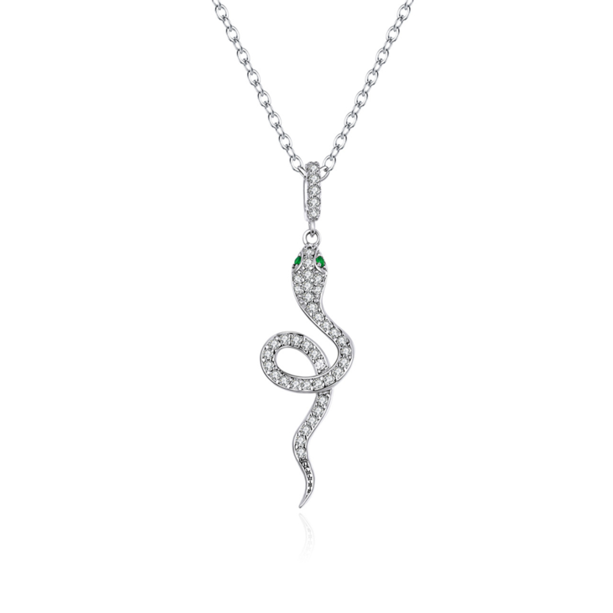 A striking pendant crafted in sterling silver, shaped into a sleek twisted snake design. The serpent’s curves catch the light beautifully, enhanced by sparkling cubic zirconia stones that add a subtle shimmer.