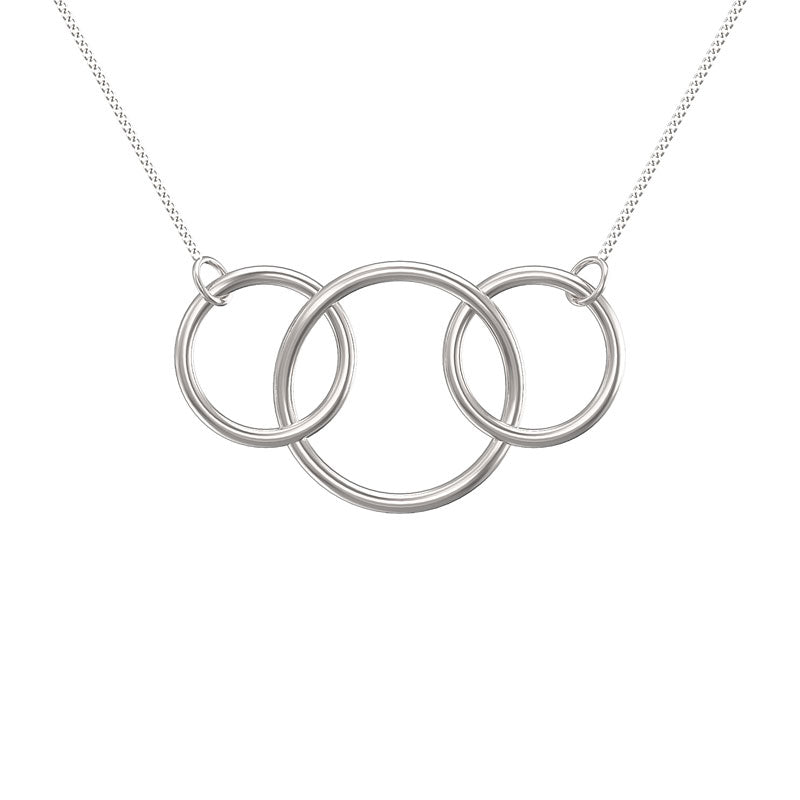 Modern elegance meets meaningful design in this sterling silver necklace featuring three interlocking circles. Symbolizing unity, connection, and continuity, the sleek circular motif offers a clean, contemporary look that complements any style.