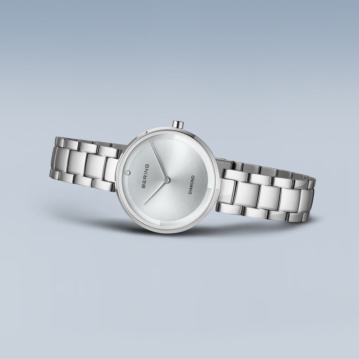 This ladies’ watch from the BERING Classic Collection embodies timeless simplicity and refined beauty. The polished silver stainless steel case (30 mm) frames a grey dial accented by a genuine diamond at 12 o’clock – a subtle highlight that enhances the minimalist design.
