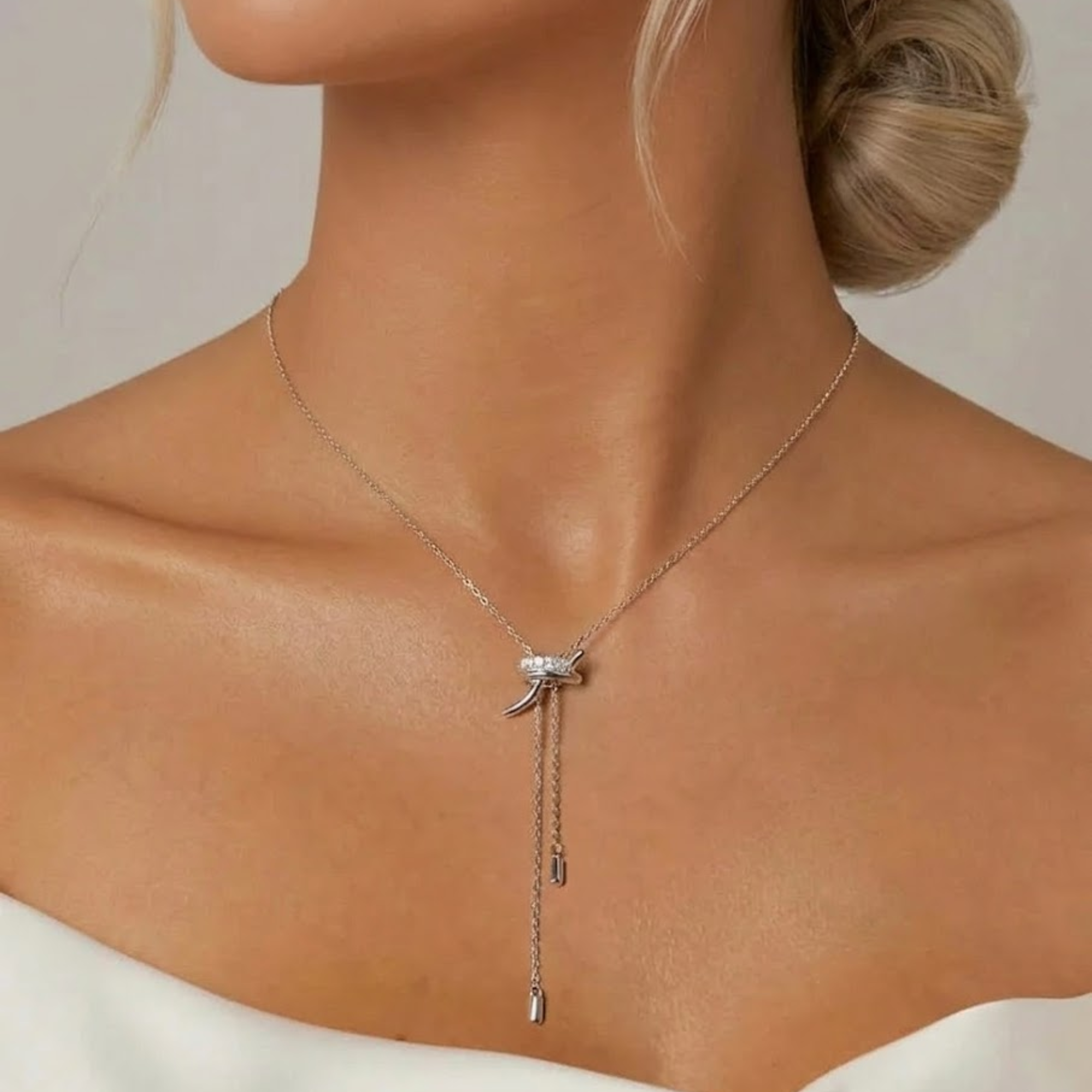 If you want a necklace that feels delicate but still makes an impact, this silver CZ bow style drop slider necklace is such a beautiful choice. The bow inspired centre is finished with sparkling clear CZ stones for a soft touch of shine, while the fine drop chains give the piece movement and a more dressed up look on the neckline. It has that lovely feminine feel that works so well for weddings, parties, date nights or any outfit that needs something a little more special, but it still feels elegant rather than too much. This is the kind of necklace you wear when you want to feel polished, pretty and a bit more confident the moment you put it on.